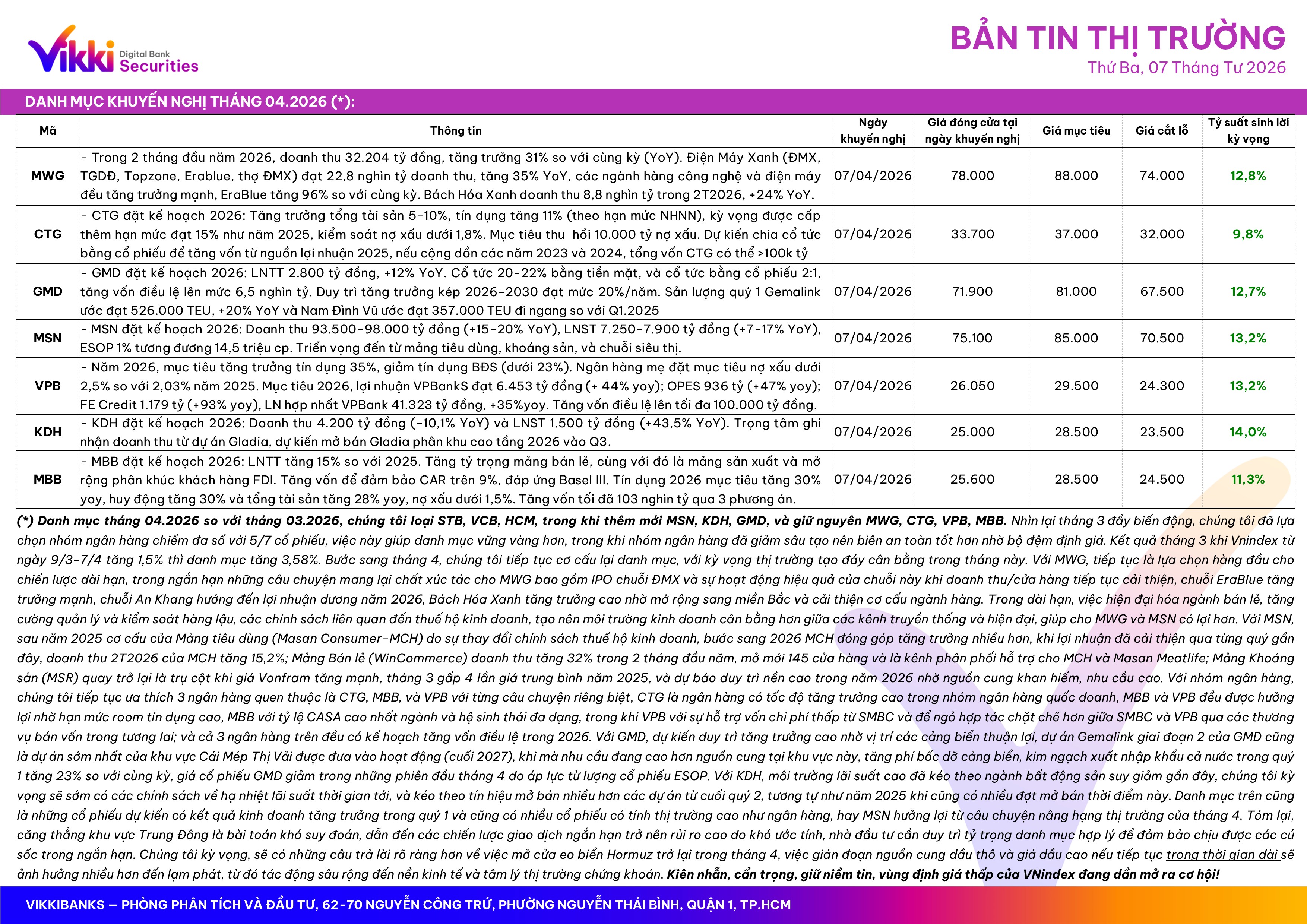 Kết thúc phiên giao dịch ngày 07/04, chỉ số VN-Index tăng nhẹ 2,55 điểm (+0,15%) đạt 1.677,54 điểm. Độ rộng thị trường nghiêng nhẹ về phía tích cực với 366 mã tăng giá so với 319 mã giảm, phản ánh tâm lý thận trọng nhưng chưa quá tiêu cực của dòng tiền. Nhóm dịch vụ truyền thông đóng vai trò dẫn dắt thị trường khi tăng 1,22%, nổi bật với đà khởi sắc của các cổ phiếu VGI (+1,23%), FOX (+1,02%) và CTR (+0,96%). Theo sau, nhóm tài chính vươn lên vị trí thứ hai với mức tăng 0,39%, được hỗ trợ bởi đà bứt phá mạnh của nhiều mã như VIX tăng trần, cùng với SSI (+2,04%), LPB (+4,12%), VND (+2,56%). Dù vậy, áp lực điều chỉnh vẫn xuất hiện cục bộ tại một số cổ phiếu ngân hàng như MBB (-0,19%), TCB (-1,2%), TCX (-1,03%) và HDB (-1,95%), phần nào kìm hãm đà tăng chung của nhóm. Nhóm ngành bất động sản và công nghiệp cũng ghi nhận lực cầu tại các cổ phiếu VIC (+1,27%), VRE (+0,19%) và CII (+2,87%), giúp 2 ngành tăng lần lượt 0,38% và 0,17%. Ngược lại, áp lực bán tập trung tại nhóm tiện ích khiến ngành này giảm mạnh nhất 1,01%, chịu tác động từ các cổ phiếu GAS, PGV và TDM. Bên cạnh đó, nhóm tiêu dùng không thiết yếu cũng suy yếu 0,69%, với các mã đáng chú ý như VPL (-0,85%), PNJ (-4,4%) và DGW (-1,72%).