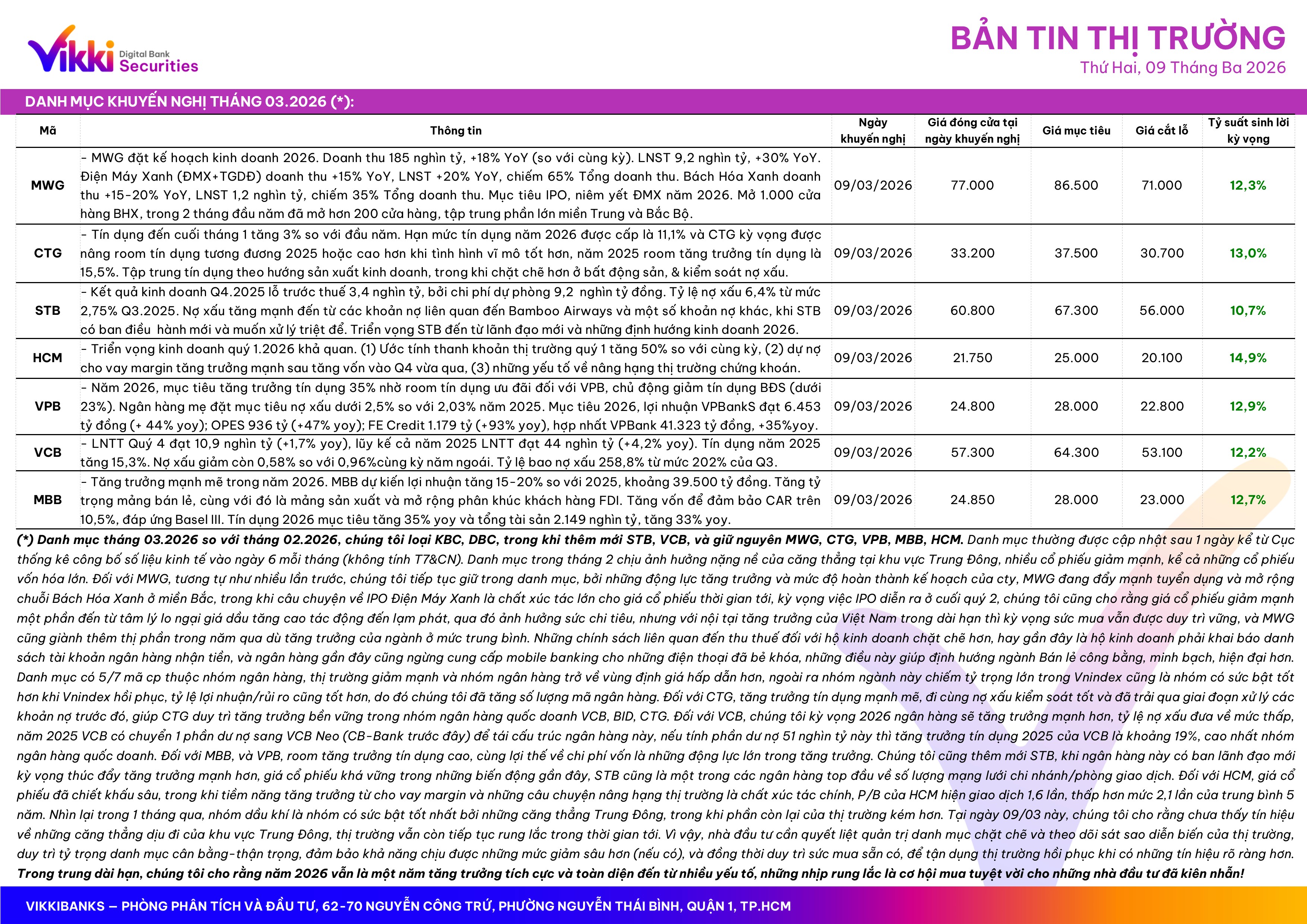 Nhìn chung, phiên tăng điểm hôm nay chủ yếu mang tính hồi phục kỹ thuật sau nhịp điều chỉnh mạnh trước đó, tuy nhiên các yếu tố bất ổn từ tình hình địa chính trị vẫn còn hiện hữu và có thể tiếp tục gây biến động lên thị trường trong thời gian tới. Trong bối cảnh đó, nhà đầu tư nên duy trì sự thận trọng, đồng thời kiểm soát tỷ lệ margin ở mức hợp lý khi thị trường vẫn có thể xuất hiện những nhịp rung lắc.
